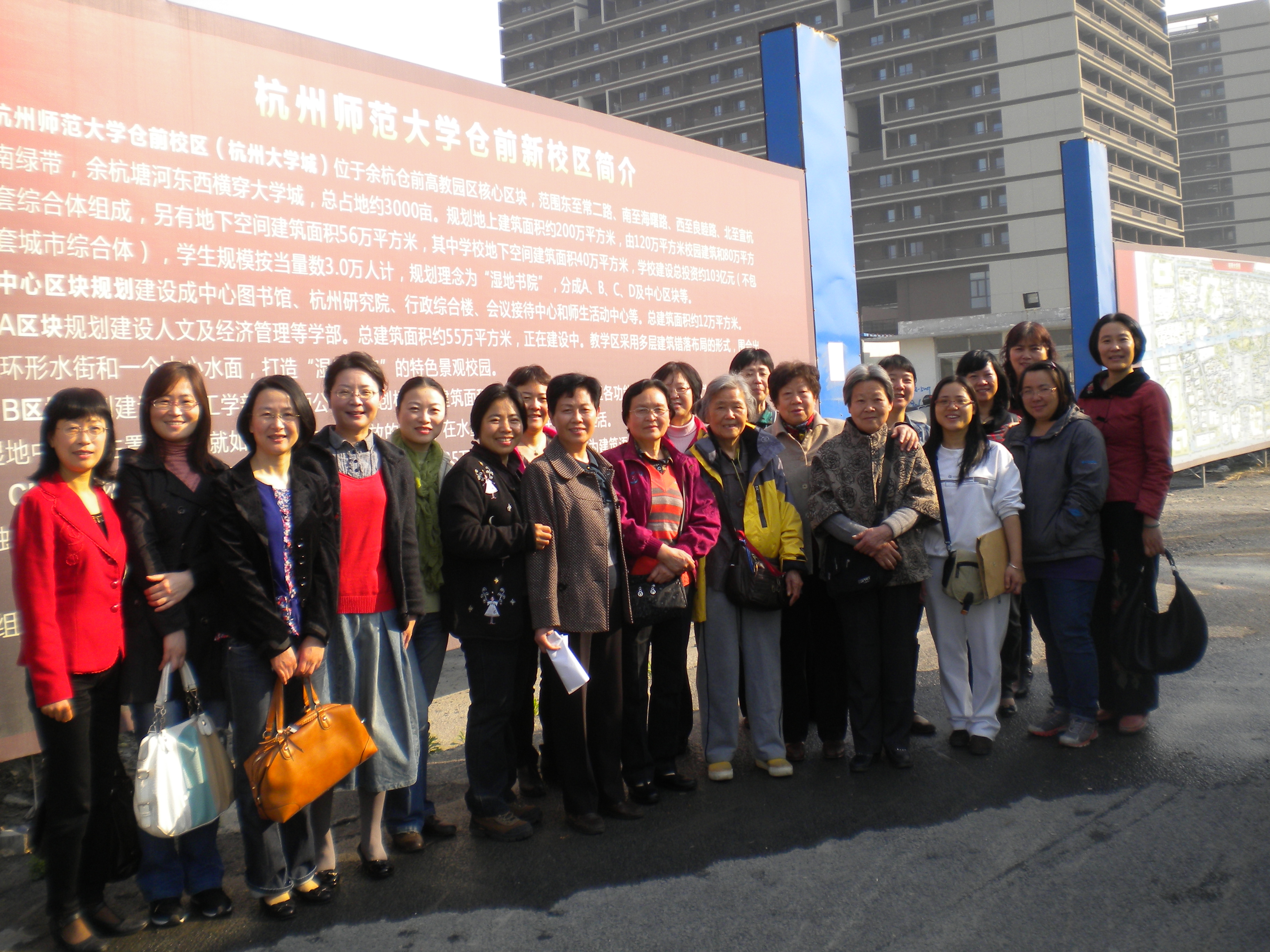 39上午,社科部女老师们一行先来到仓前新校区,参观这个即将迎接我们入驻的校区新貌。大家心情都很激动,详细观看了校区的总体规划图及A区的具体规划,车览一期工程的建设情况,体会了新校区的大气开放的特质。有的老师们还参观了部分建筑,兴致很高。特别是几个退休的老同志,更是对学校发展的日新月异深有感触。最后大家在校区门口合影留念。
