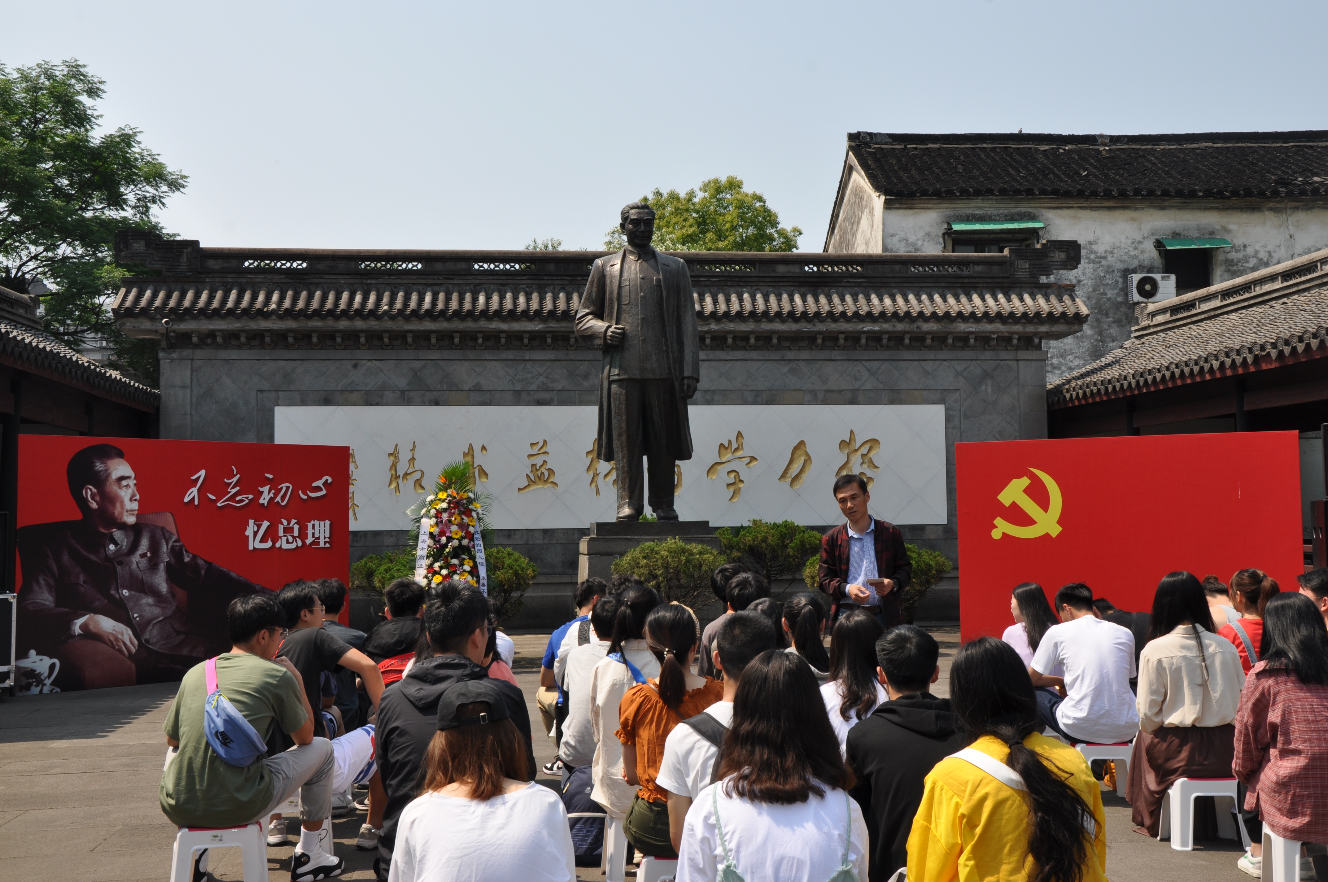 上午8点,在国产自拍 院长余龙进和副院长何丽君的带领下,满载着师生的四辆大巴分别从仓前、下沙、玉皇山校区出发前往绍兴,并于9点半到达周恩来纪念馆。在周恩来纪念广场的周恩来铜像前,国产自拍 罗一华老师对学生进行了爱国主义现场教学。罗老师缅怀了周总理的爱国情怀与丰功伟绩,带领同学们感受了伟人的伟大品格。罗老师组织同学们集体学习了习近平总书记在纪念五四运动一百周年大会上的重要讲话精神,重点强调习近平总书记对新时代中国青年提出的6点要求,并具体论述了作为国产自拍 的一名大学生,如何在伟大梦想的征程中具体弘扬伟大的五四精神,进一步号召学生们要向周总理学习:做到有情怀、有本领、有行动,在“努力学习、精益求精”的同时,坚定理想信念,在爱党爱国中,共筑青春之梦。课堂的最后环节,全体同学共同唱响《我和我的祖国》,表达了同学们立志投身于实现社会主义现代化强国的坚定理想与对祖国深切的祝福。