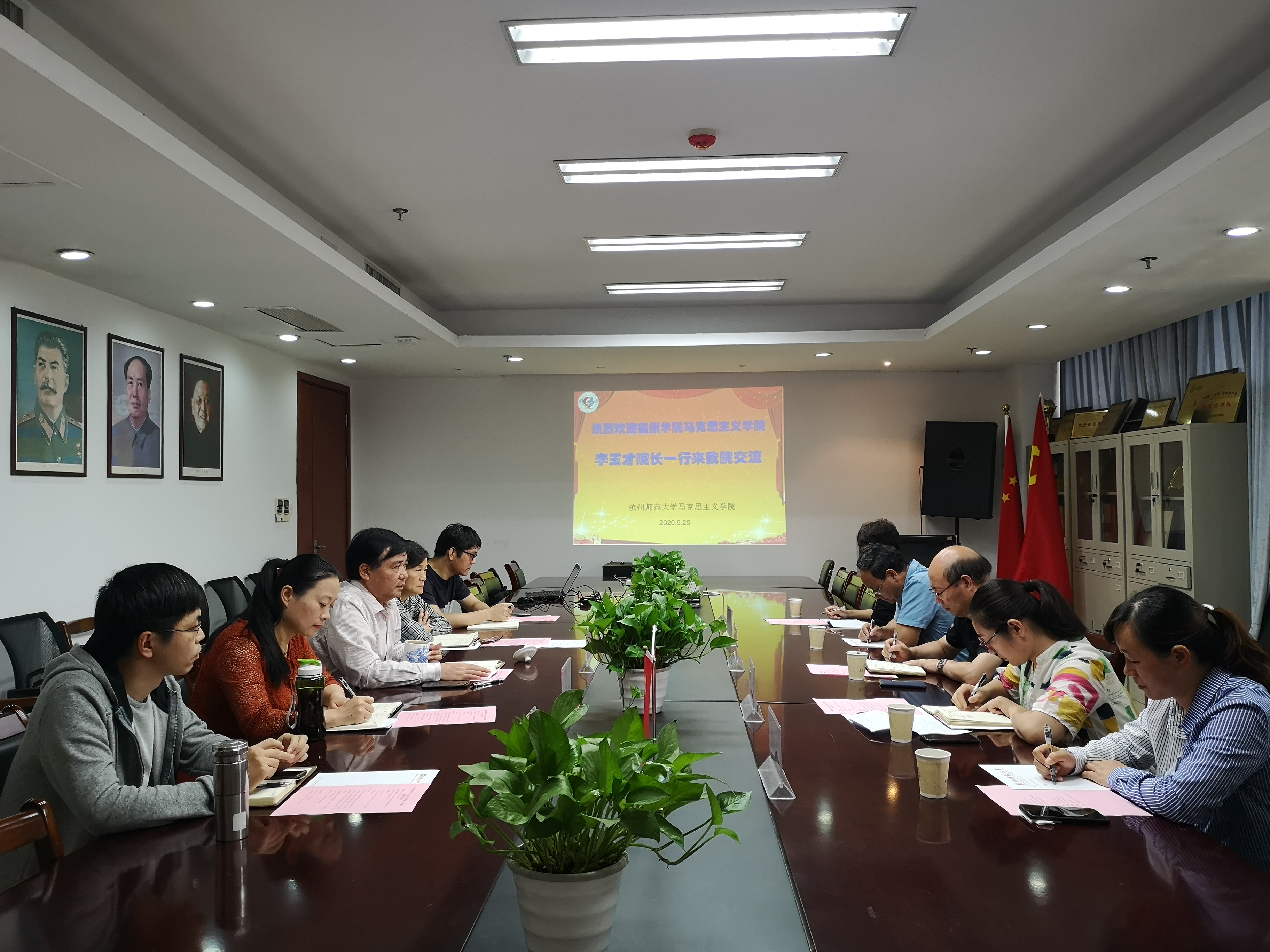 9月25日下午,宿州学院国产自拍 院长李玉才教授一行5人来国产自拍 交流。学院党总支书记、院长余龙进教授、副院长何丽君、形势与政策教研室主任徐敏、思想道德修养与法律基础教研室主任陈慧麒、原理教研室姜海波与客人围绕课程建设、学科建设、人才引进、党的建设等内容展开了深入座谈交流。