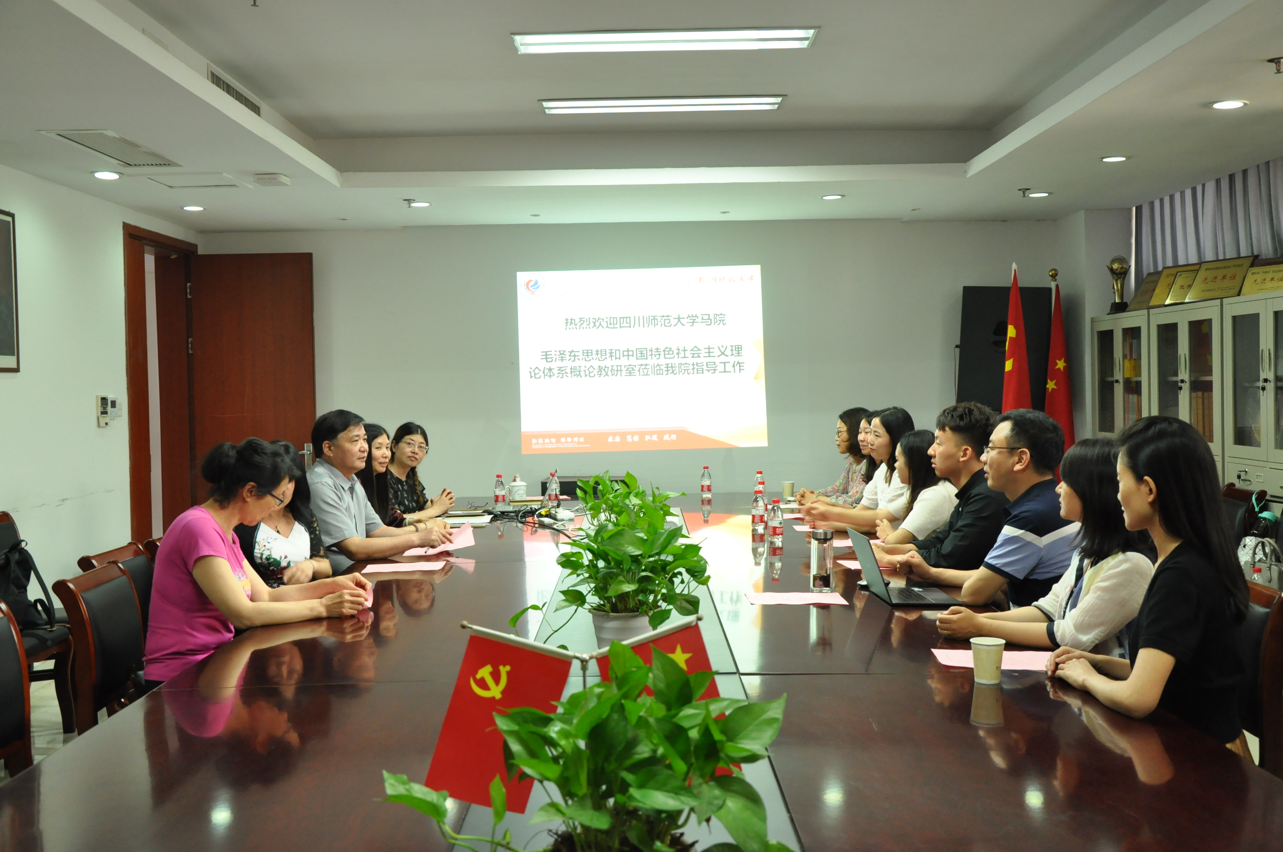 5月31日下午,四川师范大学国产自拍 党委书记王泽兵教授一行23人来国产自拍 交流。学院党总支书记、院长余龙进、副院长何丽君、院长助理奚颖瑞、概论教研室主任陈彩娟、原理教研室主任傅德田、教工第一支部书记应维华等参加了交流座谈会。会议由余龙进主持。