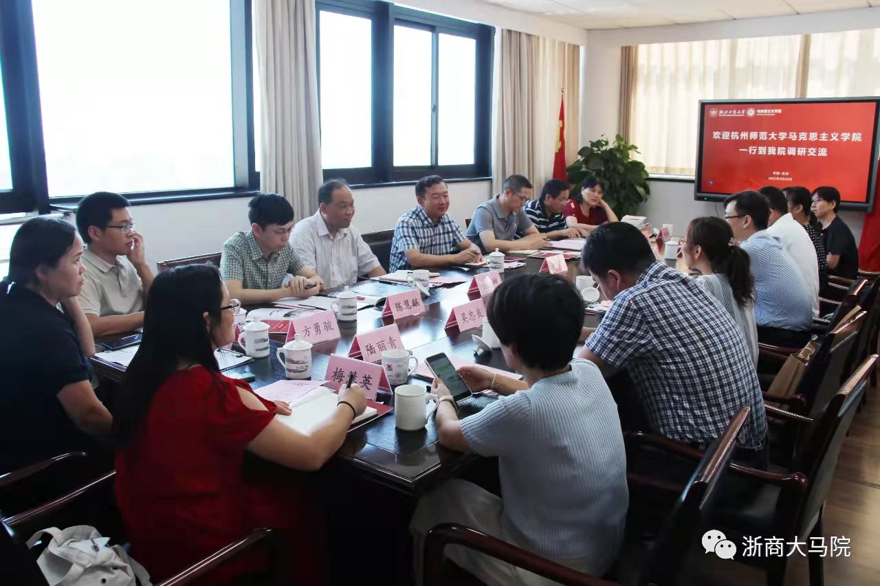 为进一步增强学校之间的沟通交流,学习借鉴其他高校在国产自拍 建设和思想政治理论课教学改革等方面的先进经验,9月24日,在院长、党委书记李洪波带领下,国产自拍 一行9人赴浙江工商大学调研、交流,学院党委副书记应维华,副院长张坤参加调研活动,教研室主任、综合办、教务办均派人参加。