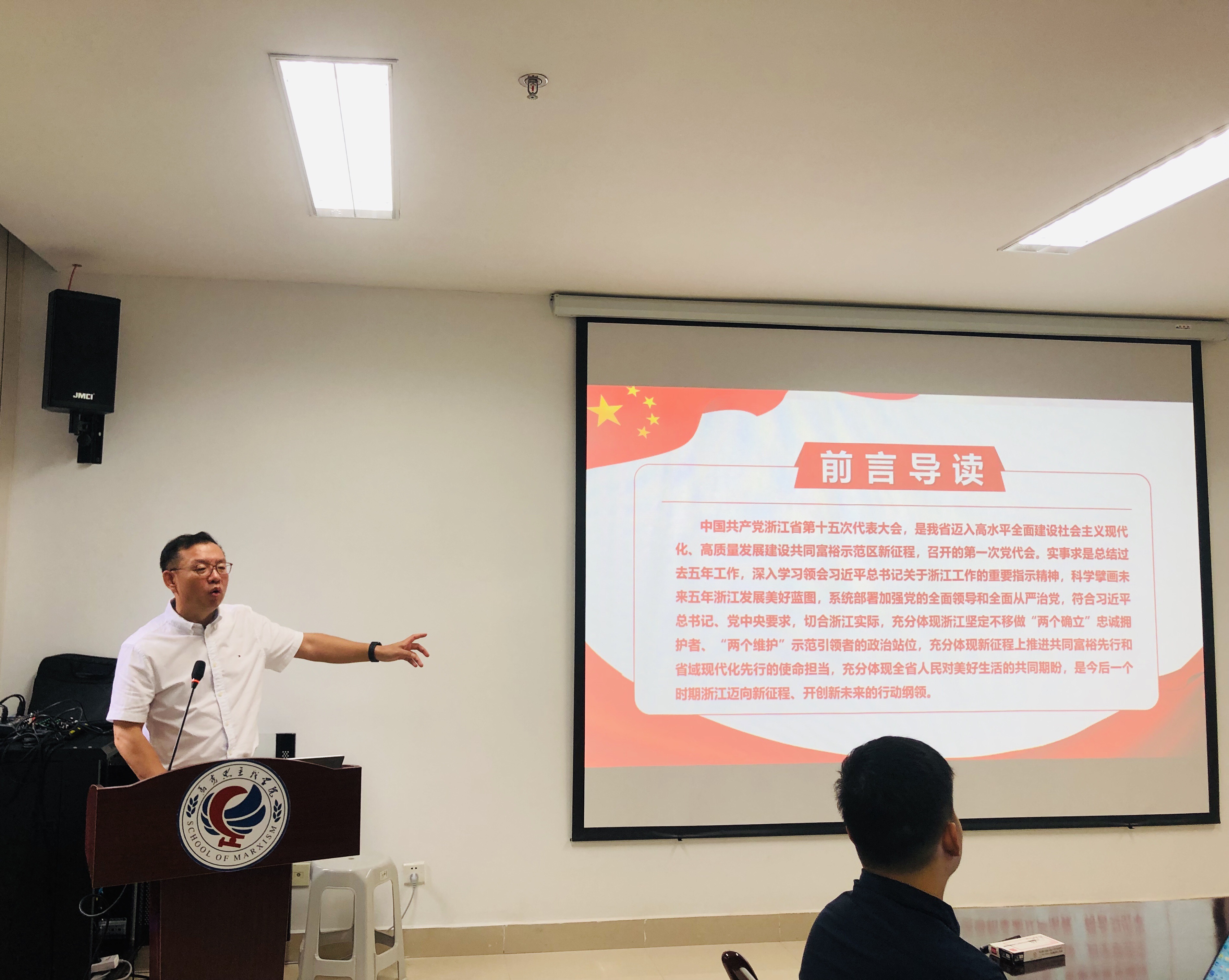 会上,李院长传达学习了省第十五次党代会精神,围绕省第十五次党代会报告“9方面历史性成就”和“8方面规律性认识”“两个先行”奋斗目标和“8个高地”具体目标、“5大战略指引”和“11方面重要遵循”、加强党的全面领导和全面从严治党等内容进行了解读。他指出,深入学习宣传贯彻好省党代会精神是当前和今后一个时期的重大政治任务,作为马克思主义的理论工作者、思政课教师,要努力做省第十五次党代会精神学习的先行者、研究和宣传的先行者以及践行党代会精神的先行者。