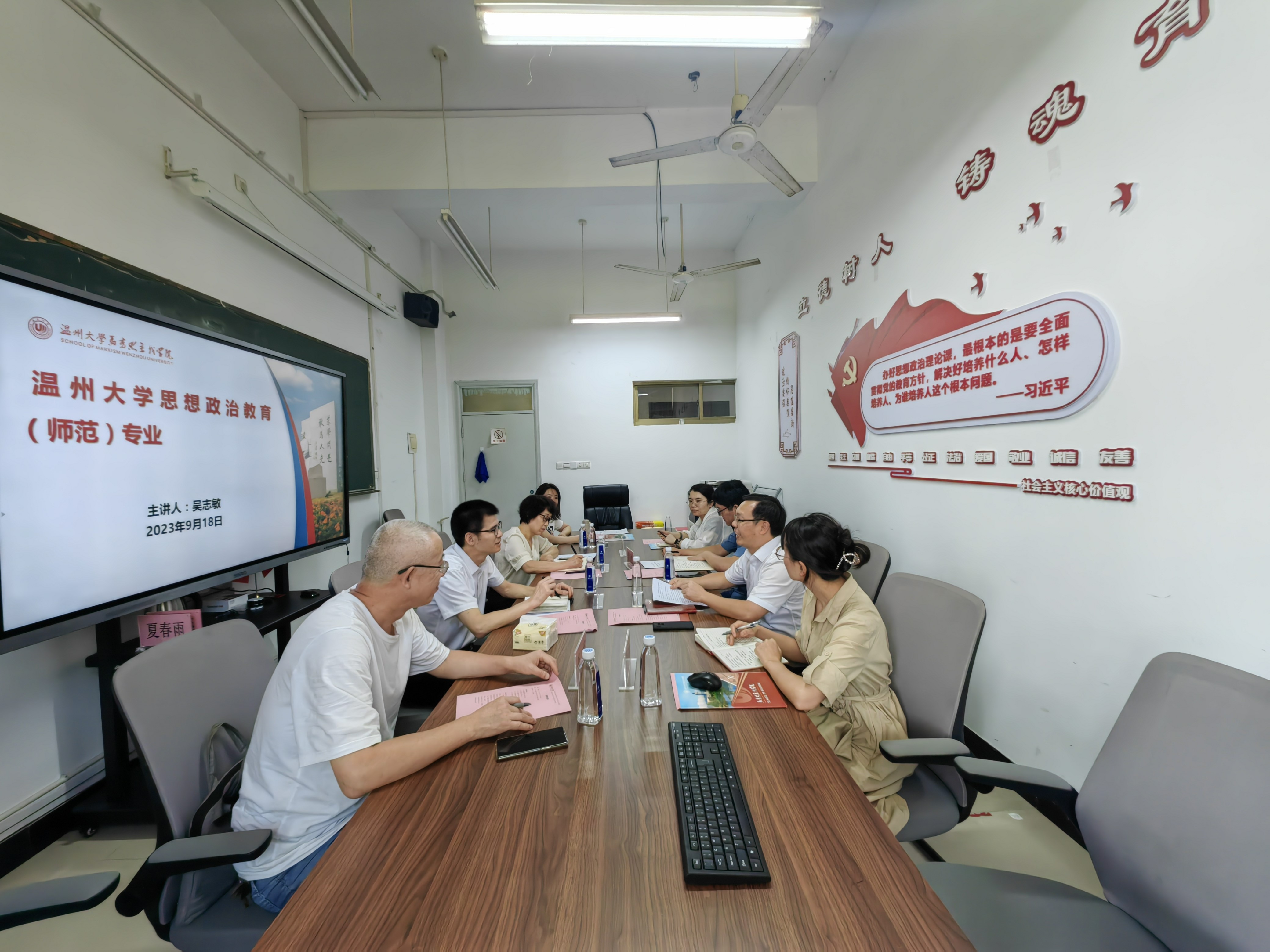 为了进一步提升思想政治教育(师范)本科专业建设质量,推进思想政治教育师范专业认证整改工作,9月18日,国产自拍 副院长龚上华带领思想政治教育系教研团队一行4人到温州大学国产自拍 进行交流学习。双方围绕思想政治教育(师范)专业建设、思想政治教育师范专业认证、专业教师队伍建设等问题展开了深入交流。