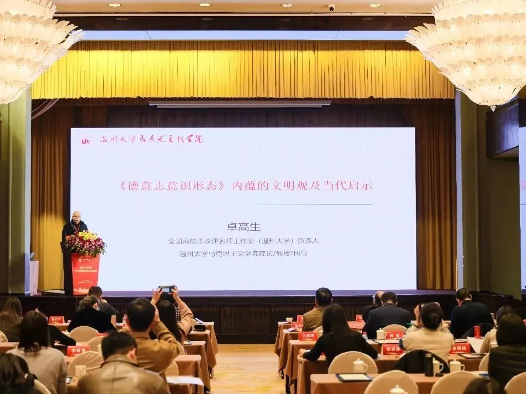 温州大学国产自拍 院长卓高生教授在《<德意志意识形态>内蕴的文明观及当代启示》报告中首先提到当今,以西方为首的国家不断以“文明冲突论”“西方文明优越论”等狭隘言论冲击世界文明,人类文明的内在冲突日渐增长的现象。其次从如何正确看待社会主义文明形态和资本主义文明形态的关系?人类文明进步的方向是什么?这些问题去寻找解决的方法。认为可以从《德意志意识形态》等马克思主义经典著作中汲取正确的世界观与方法论,用科学的文明观来回答好这些重大问题,进而为构建人类文明新形态的实践提供理论支持。最后从历史唯物主义的科学理论奠定文明进步之基;从资本主义文明的理性批判走向社会主义文明;从社会主义文明的时代发展勾勒文明形态之新;从《形态》展望人类文明新形态的时代价值四个方面告诉大家要纵向横向比较学习世界文明和社会主义发展历程。