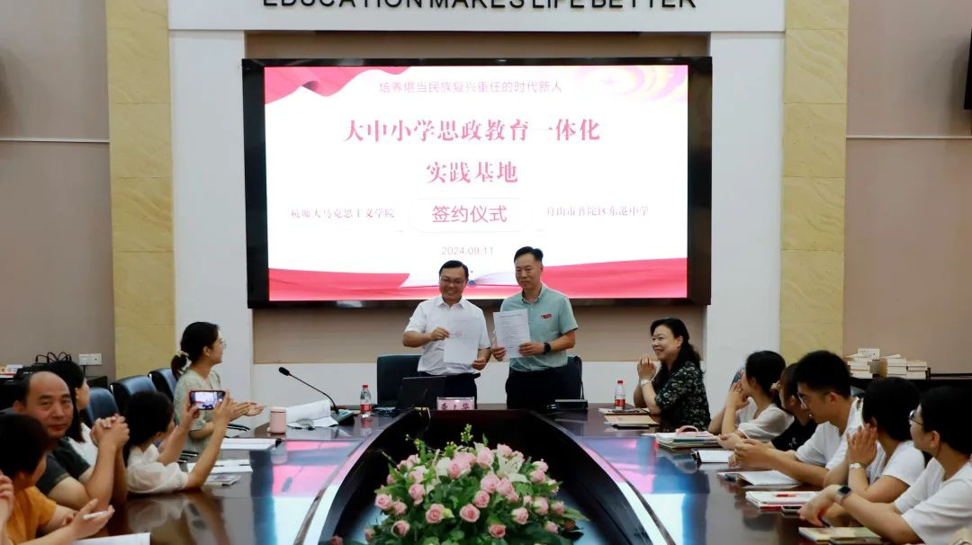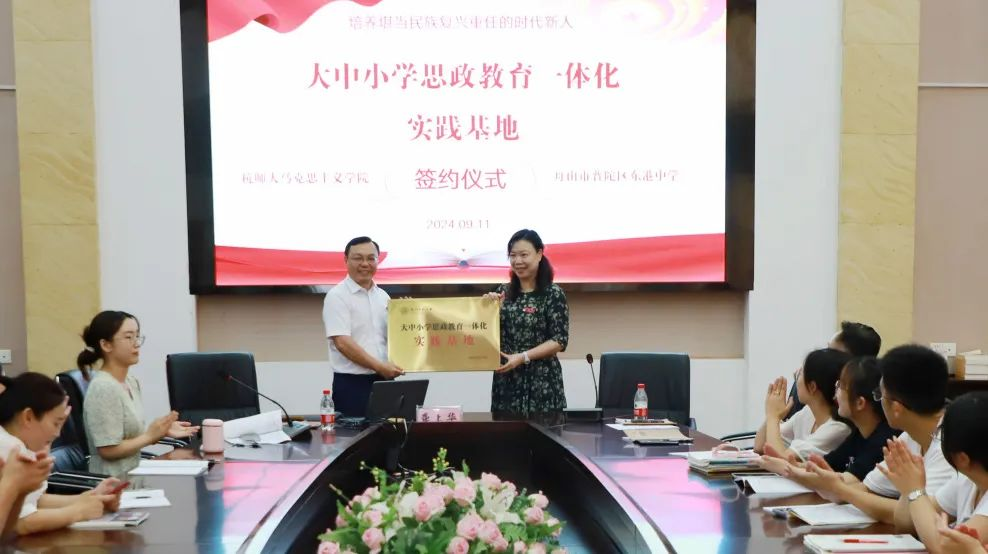 2024年9月11日上午,国产自拍 与舟山市普陀区东港中学举行党建联建、大中小学思政教育一体化、教育实习实践基地建设签约及授牌仪式。