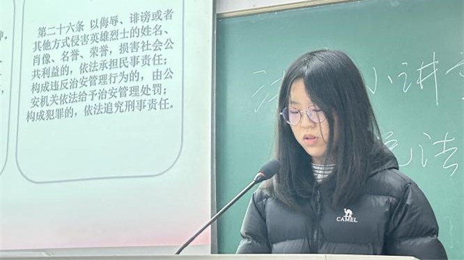 第二组:思政231班的阿依扎达·对先、章娅楠、扎黑拉·努尔汗同学,分享了一起关于冒名顶替上学的案例。通过此案为同学们讲解了宪法是保护每个人权利的最高法律,违反宪法将会受到法律的制裁。