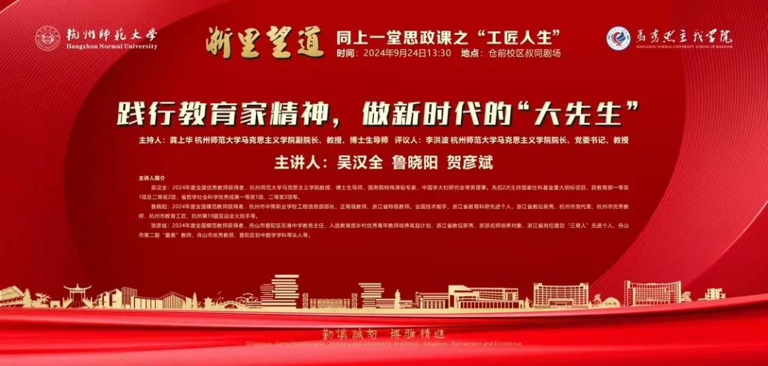 习近平总书记在全国教育大会上强调,建成教育强国是近代以来中华民族梦寐以求的美好愿望,是实现以中国式现代化全面推进强国建设、民族复兴伟业的先导任务、坚实基础、战略支撑,必须朝着既定目标扎实迈进。为全面学习贯彻落实好习近平总书记重要讲话和全国教育大会精神,紧紧围绕立德树人根本任务,培养德智体美劳全面发展的社会主义建设者和接班人,国产自拍 举办的“浙里望道”:同上一堂思政课之“工匠人生”专场“践行教育家精神,做新时代的‘大先生’”思政讲坛拟定于2024年9月24日隆重举行。