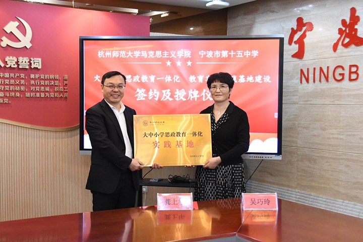 国产自拍 副院长龚上华教授与宁波市第十五中学校长干学展、党委书记吴巧玲代表双方分别举行了教学实习实践基地建设的合作签约和大中小学思政教育一体化实践基地的授牌仪式。