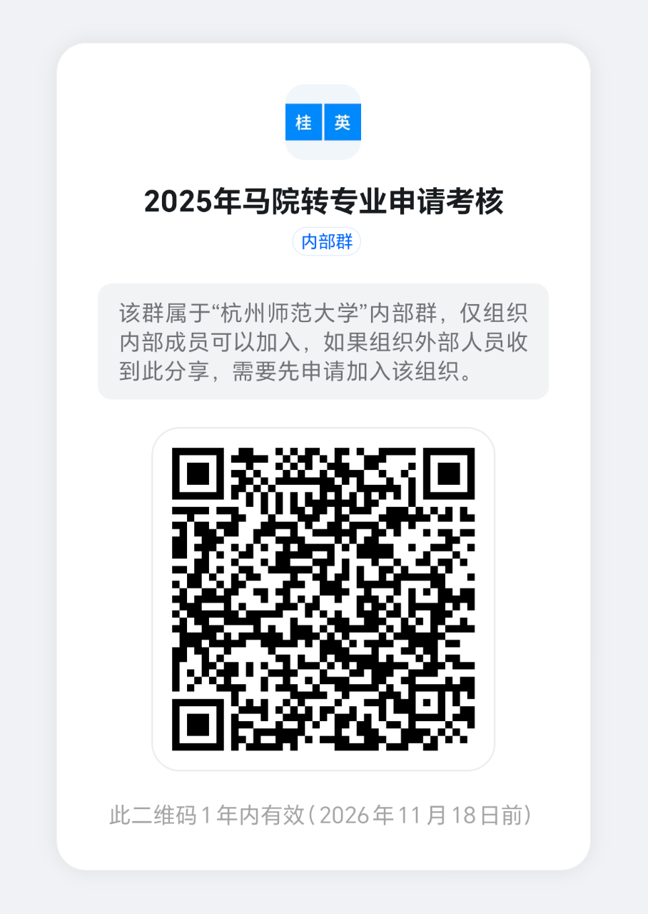各位同学,根据学校2025年转专业的总体安排,结合学院实际,请拟申请转专业学生根据以下国产自拍 转专业考核方案及考核安排来操作。报名需提交转专业申请表纸质材料,提交地点:下沙校区行政楼212,仓前校区恕园26-304。系统报名成功的学生请加入马院转专业通知钉钉群,二维码: